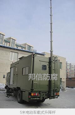 自動升降避雷針根據安裝方式的不同,可分為固定式和移動式。移動式車載避雷針防雷裝置與同類產品相比,具有升降速度快、可靠性高、耐久性強、穩定、重量輕、閉合高度小、攜帶方便等特點。升降方式分手動和電動、自動三種,邦信車載升降式避雷針防雷裝置可升高高度為3—30米,閉合高度在1.2-5米,主桿重量15Kg-200Kg。廣泛適用于移動、消防、水利、鐵路、電力、建筑、野外施工、大型文體活動、抗災救災等應急的雷電防護。使用自動升降式避雷針,能使野外工作更加方便sfe。 車載自動升降式防雷裝置系統,由車載避雷針和接地裝置組成,避雷針包括:豎直固定于車上的絕緣外套,固封在該外套腔體內的絕緣內套、封裝在該內套中纏繞于絕緣棒上的彼此呈反向螺旋、且為并聯的一對無感應繞組,固連于該繞組上端頭的接閃器,固連于該繞組下端頭的引下線接頭座;接地裝置包括:行車狀態中,與避雷針引下線接頭座連接的引下線接地電纜,該電纜與引下線接頭座連接、而底端為多分枝的接地導綫;停車狀態,與避雷針引下線接頭座連接的引下線接地電纜,其與引下線接頭座連接、底端與固定在地面上的金屬接地樁連接,接地電阻應符合GB50057-2010規范要求;優點是結構簡單、能抑制雷電的電磁感應,避免遭受雷擊,提高了車輛及裝備對雷電的防護能力。